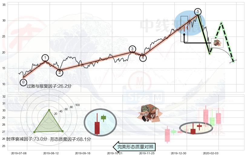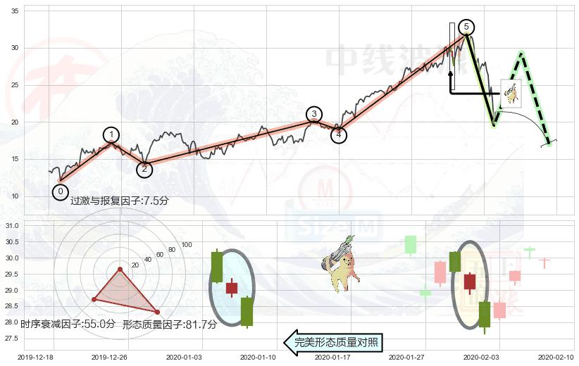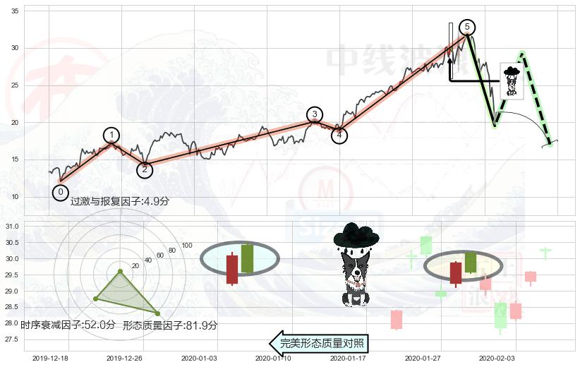 ➢ 🕰 价格走势在2020-01-06至2020-01-13期间形成顶部尽头线(下山虎),残存影响值:-3.49