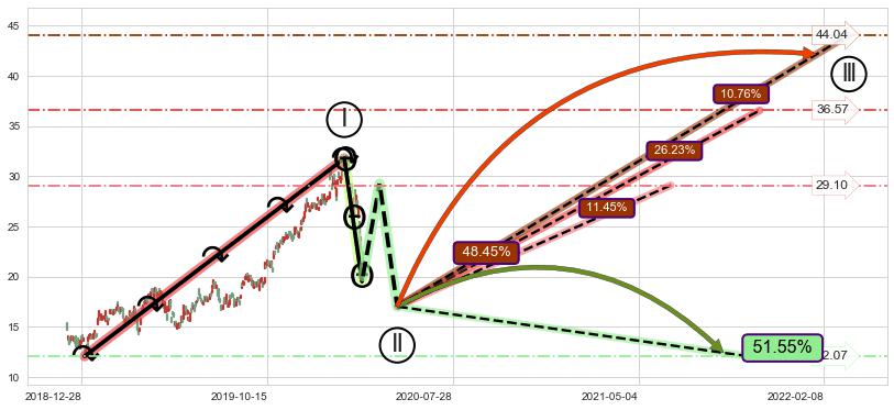 ➣ 高概率大级别循环上涨浪被破坏,反转向下(突破5浪起点)概率51.55%
