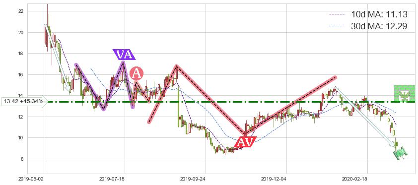 ♘ 阻力价格位13.42,可信任强度65.63%,距离最后交易2020-03-13形成的收盘价格9.23相差 +45.34%