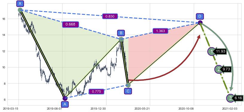 ➣ 谐波蝙蝠:b下跌接近c:猜想支撑性拉升 → 上涨 →【拐点】支撑临近 → 大趋势均值回复