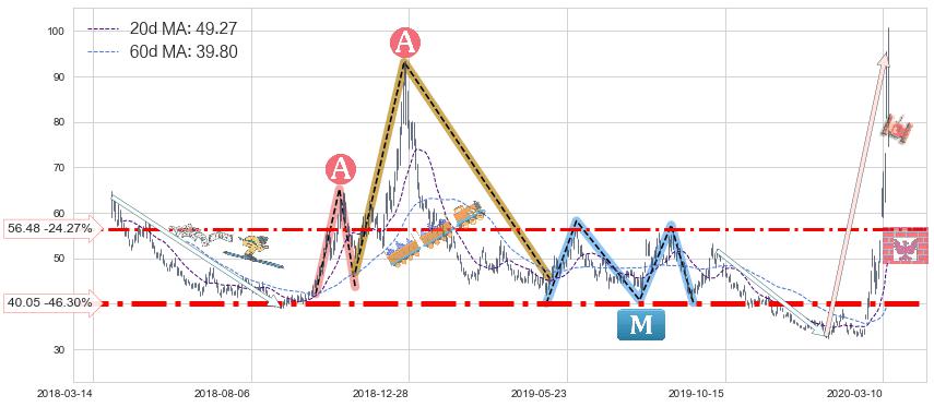♘ 支撑价格位40.05,可信任强度88.40%,距离最后交易2020-03-13形成的收盘价格74.58相差 -46.30%