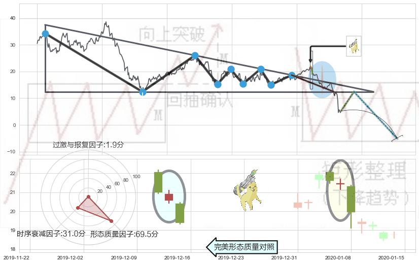 ➣ 下跌螺旋桨 + 下降三角整理支撑破位转换阻力下跌信号叠加后【目标达成率】中等,【看空】信号叠加【存续影响中等】