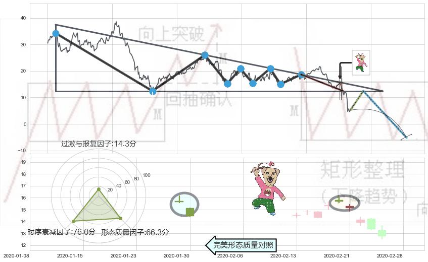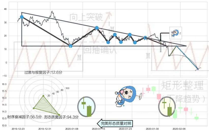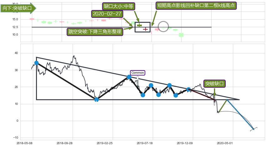 ➢ 【多方力量耗尽,空方打破攻守平衡点】下降三角形中继整理, 已在2020-02-27突破【支撑】颈线 12.43 →演变成下降通道
