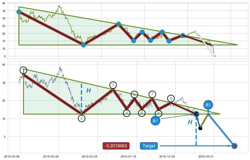 ➣ 下降三角整理:关键支撑位被击穿 → 猜想形成趋势持续下跌 → 风险信号 → 大趋势均值回复