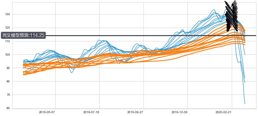 ➣ 70小时均线于(2020-02-21: 124.48)形成【死叉】基于【死叉历史模型】预测死叉后最低波谷价格: 110.08, 死叉后最低价格45.76,已经下跌超出预测最低波谷价格, 预期反弹