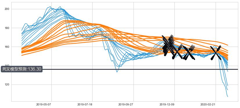 ➣ 90小时均线于(2020-01-02: 153.95)形成【死叉】基于【死叉历史模型】预测死叉后最低波谷价格: 133.33, 死叉后最低价格97.85,已经下跌超出预测最低波谷价格, 预期反弹