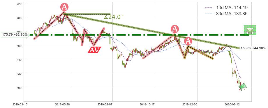 ♘ 阻力价格位175.79,可信任强度99.00%,距离最后交易2020-03-13形成的收盘价格107.88相差 +62.95%