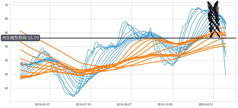 ➢ 70小时均线于(2020-02-24: 60.74)形成【死叉】基于【死叉历史模型】预测死叉后最低波谷价格: 51.97, 死叉后最低价格39.11,已经下跌超出预测最低波谷价格, 预期反弹