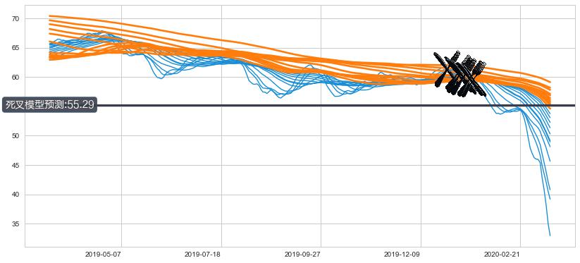 ➣ 70小时均线于(2020-01-14: 59.52)形成【死叉】基于【死叉历史模型】预测死叉后最低波谷价格: 54.21, 死叉后最低价格29.47,已经下跌超出预测最低波谷价格, 预期反弹