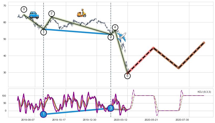 ➣ 第一, 三驱动浪端点:【KDJ】走势出现【常规背离 & 反转信号】背离程度99.00%,背离夹角角度27.9˚,背离程度较大