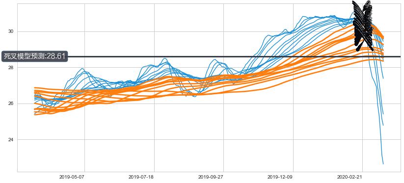 ➣ 70小时均线于(2020-02-21: 30.50)形成【死叉】基于【死叉历史模型】预测死叉后最低波谷价格: 28.47, 死叉后最低价格20.37,已经下跌超出预测最低波谷价格, 预期反弹