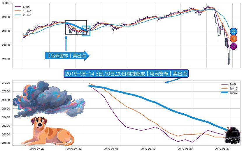 ⚀ 2019-07-31日-2019-08-27日显现 5日-10日-20日均线 【乌云密布】卖出点 看空信号,后市看跌,卖出