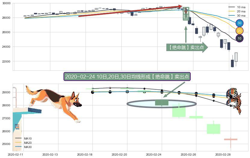⚀ 2020-02-24日显现 10日-20日-30日均线 【绝命跳】卖出点 看空信号,后市看跌,卖出