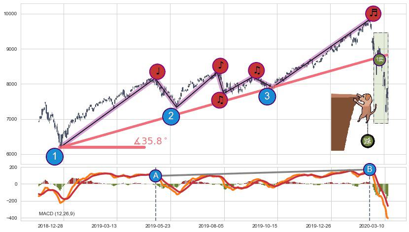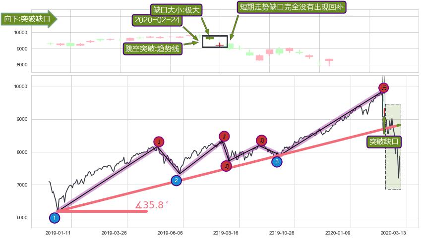 ➣ 2018-12-24-2020-03-11上升趋势存在反转[风险],其原上升趋势的支撑位(8823.63)已破位[强阻力信号],原上升趋势角度: 35.8˚