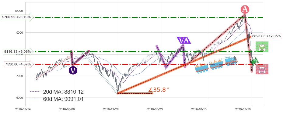 ✂️ 2018-12-24-2020-03-11上升趋势存在反转[风险],其原上升趋势的支撑位(8823.63)已破位[强阻力信号],原上升趋势角度: 35.8˚