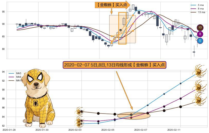 形态多维评估: ⚀ 2020-02-07日显现 5日-8日-13日均线 【金蜘蛛】买入点 看多信号,后市看涨,买入