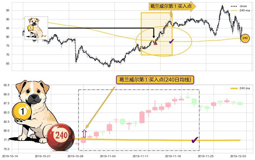 形态多维评估: ⚀ 2019-10-28-日显现 葛兰威尔均线 240日均线 第买①入点 走势反转见底信号,后市看涨,买进信号