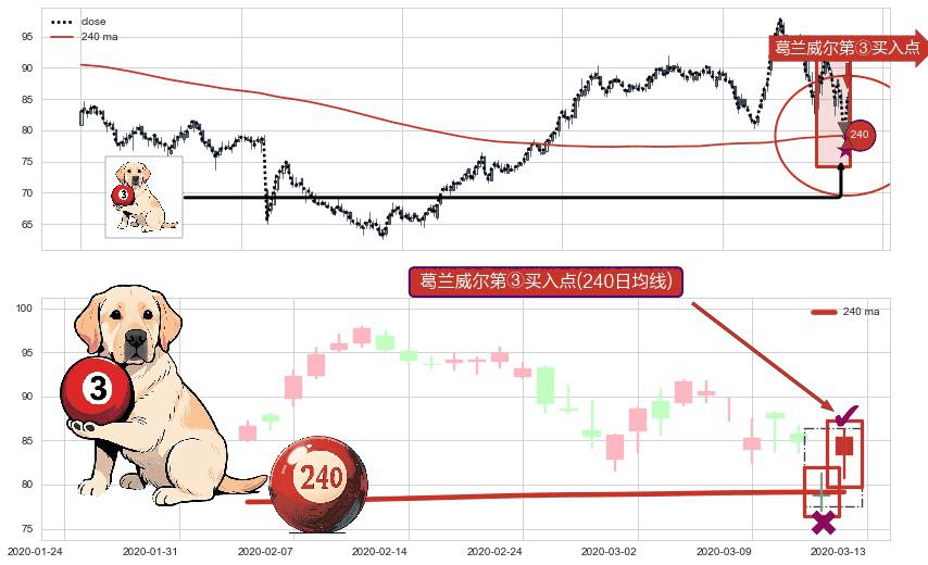 形态多维评估: ⚀ 2020-03-13-日显现 葛兰威尔均线 240日均线 第③买入点 上升趋势的中继信号,后市看涨,买进信号