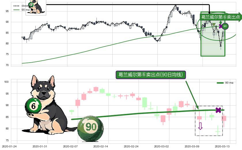 形态多维评估: ⚀ 2020-03-09-日显现 葛兰威尔均线 90日均线 第⑥卖出点 走势反转见顶信号,后市看跌,卖出信号