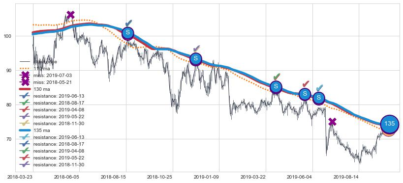 下跌趋势2018-03-23-2019-09-19,均线130, 135确认关键阻力5处
