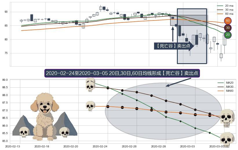⚂ 【死亡谷】卖出点 由MA20均线下穿MA30均线和MA60均线,MA30均线下穿MA60均线形成