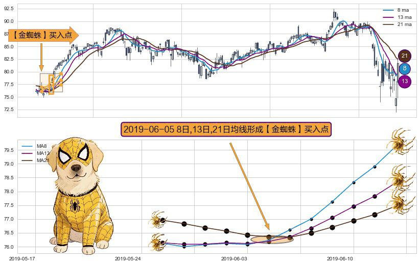 ⚀ 2019-06-05日显现 8日-13日-21日均线 【金蜘蛛】买入点 看多信号,后市看涨,买入