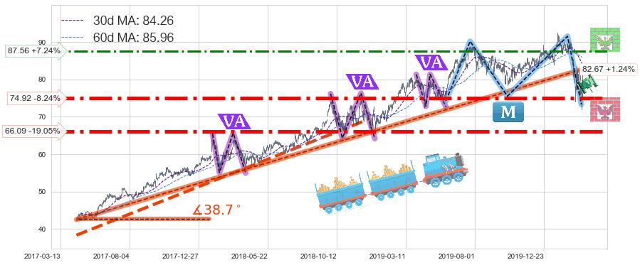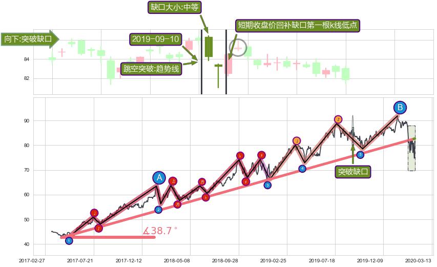 ✂️ 2017-04-13-2020-03-11上升趋势存在反转[风险],虽然原上升趋势的支撑位(82.67)已破位,但其支撑效果尚存,原上升趋势角度: 38.7˚