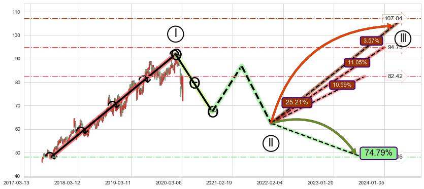 ➢ 大趋势走坏(跌破5浪起点位置)概率74.79%