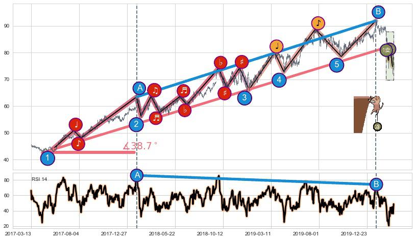 ➣ 2017-04-13-2020-03-11上升趋势存在反转[风险],虽然原上升趋势的支撑位(82.67)已破位,但其支撑效果尚存,原上升趋势角度: 38.7˚