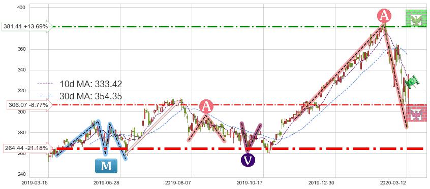 ♘ 支撑价格位306.07,可信任强度52.95%,距离最后交易2020-03-13形成的收盘价格335.50相差 -8.77%