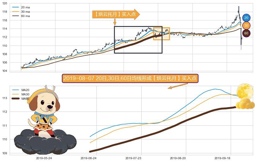烘云托月是均线组合看多信号,后市看涨,买入信号,烘云托月与均线粘合形态和上升途中均线被动修复部分竞合,整体上是多头排列行情中的 一段,属于趋势跟踪信号,上涨中继信号,量化止盈信号