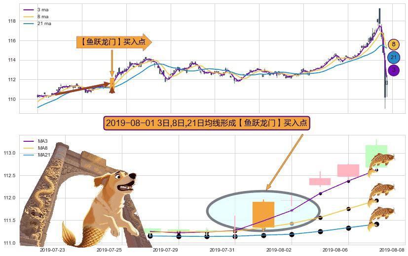 形态多维评估: ⚀ 2019-08-01日显现 3日-8日-21日均线 【鱼跃龙门】买入点 看多信号,后市看涨,买入