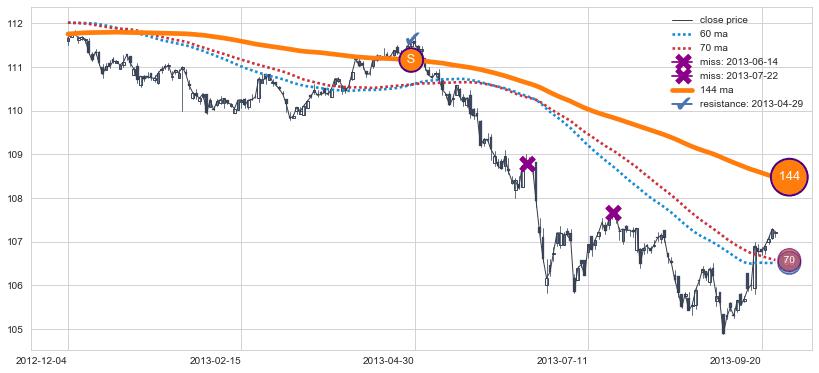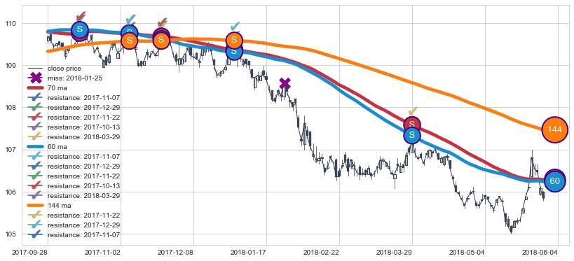 下跌趋势2017-09-28-2018-06-04,均线144, 60, 70确认关键阻力5处