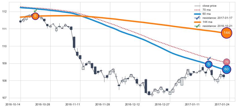 下跌趋势2016-10-14-2017-01-24,均线144, 60确认关键阻力2处