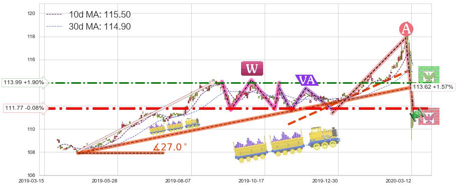 ♘ 阻力价格位113.99,可信任强度62.75%,距离最后交易2020-03-13形成的收盘价格111.86相差 +1.90%