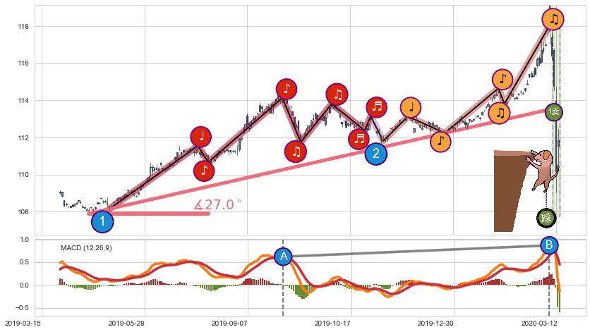 ✂️ 2019-04-17-2020-03-11上升趋势存在反转[风险],其原上升趋势的支撑位(113.62)已破位[强阻力信号],原上升趋势角度: 27.0˚