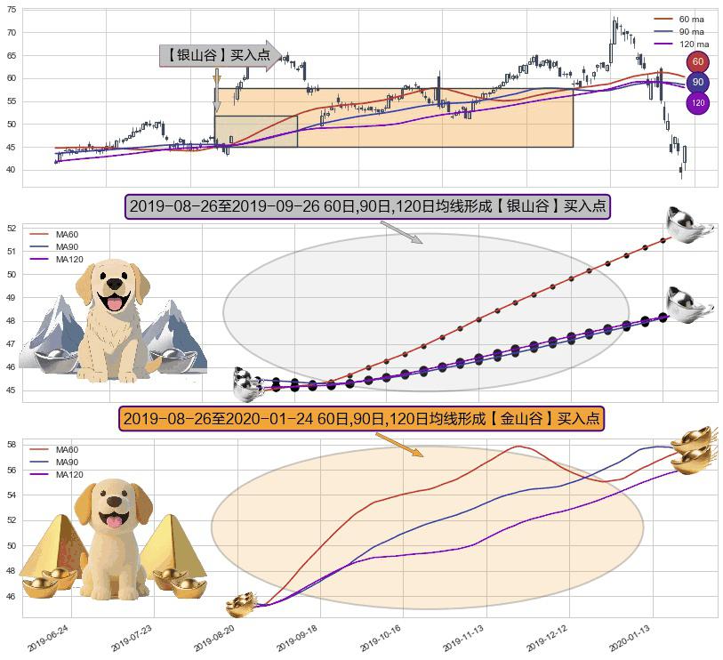 ⚃ 2019-08-27-日至2020-01-24-日显现 60日-90日-120日均线 【金山谷】买入点 其再次确认了买入信号,可靠性更强,买入