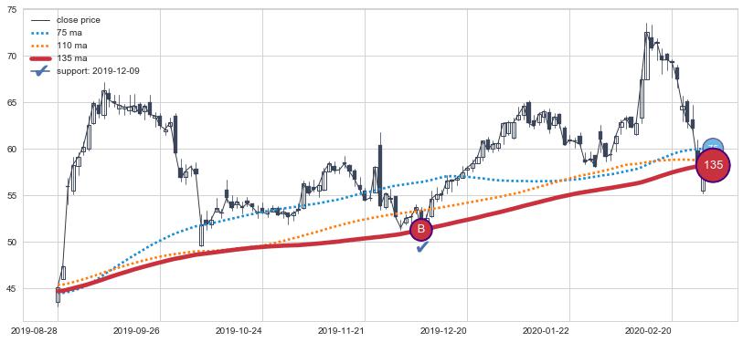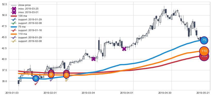 上涨趋势2019-01-03-2019-05-21,均线75, 110, 135确认关键支撑3处