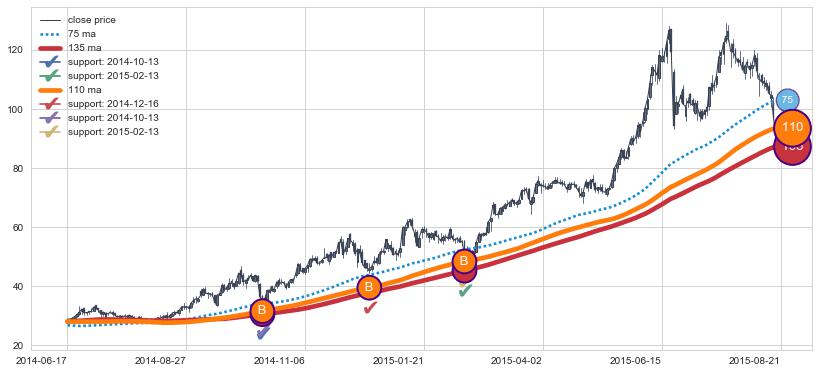 上涨趋势2014-06-17-2015-08-21,均线110, 135确认关键支撑3处