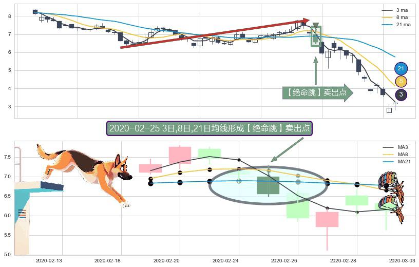 形态多维评估: ⚀ 2020-02-25日显现 3日-8日-21日均线 【绝命跳】卖出点 看空信号,后市看跌,卖出