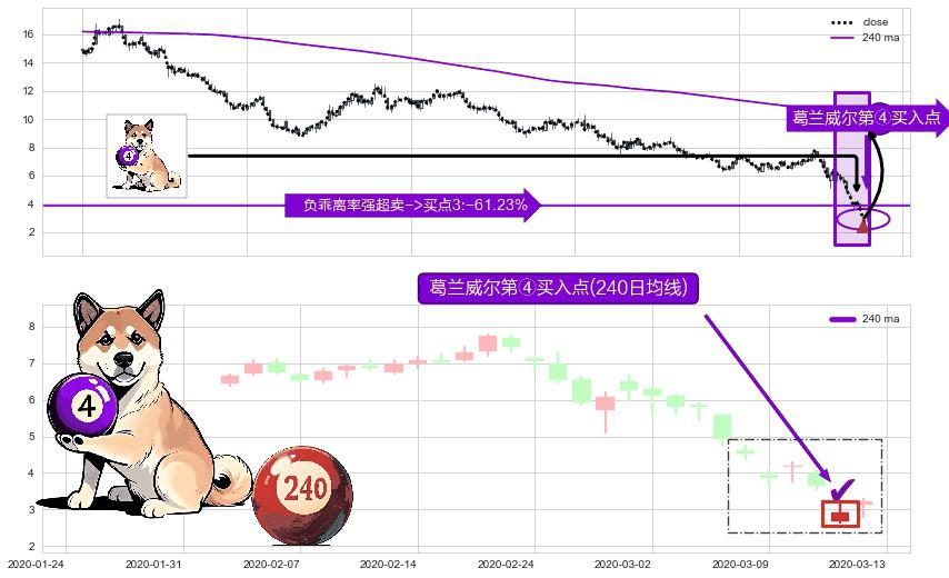 形态多维评估: ⚀ 2020-03-12-日显现 葛兰威尔均线 240日均线 第④买入点 下降趋势均值回复的短线反弹信号,后市看涨,买进信号