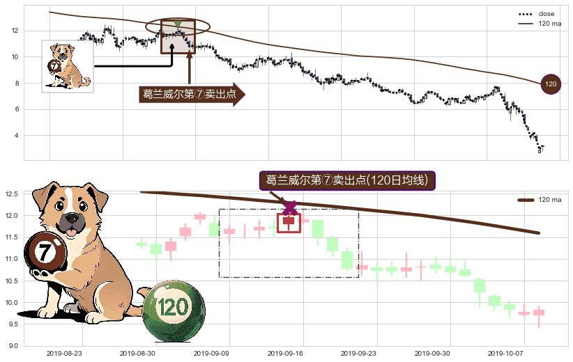形态多维评估: ⚀ 2019-09-13-日显现 葛兰威尔均线 120日均线 第⑦卖出点 下降趋势的中继信号,后市看跌,卖出信号