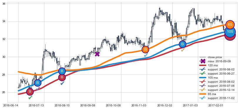 上涨趋势2016-06-14-2017-02-03,均线120, 105, 65确认关键支撑5处