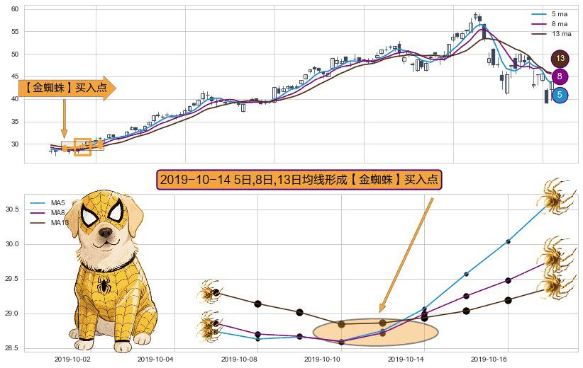 ⚀ 2019-10-14日显现 5日-8日-13日均线 【金蜘蛛】买入点 看多信号,后市看涨,买入