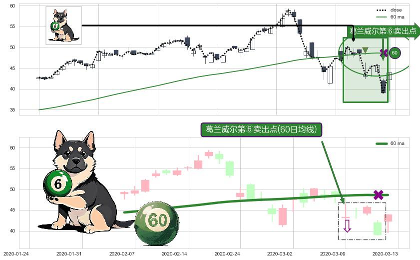 ⚀ 2020-03-09-日显现 葛兰威尔均线 60日均线 第⑥卖出点 走势反转见顶信号,后市看跌,卖出信号