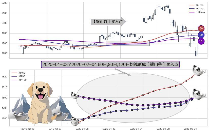 形态多维评估: ⚀ 2020-01-06-日至2020-02-04-日显现 60日-90日-120日均线 【银山谷】买入点 看多信号,后市看涨,买入