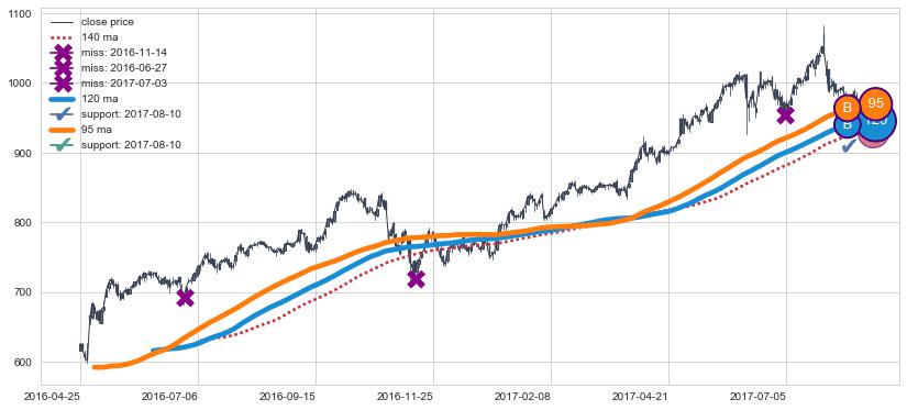 上涨趋势2016-04-25-2017-08-17,均线120, 95确认关键支撑1处
