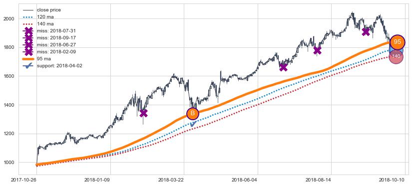 上涨趋势2017-10-26-2018-10-10,均线95确认关键支撑1处
