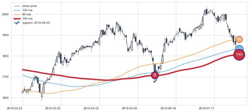 上涨趋势2019-02-22-2019-08-01,均线140确认关键支撑1处