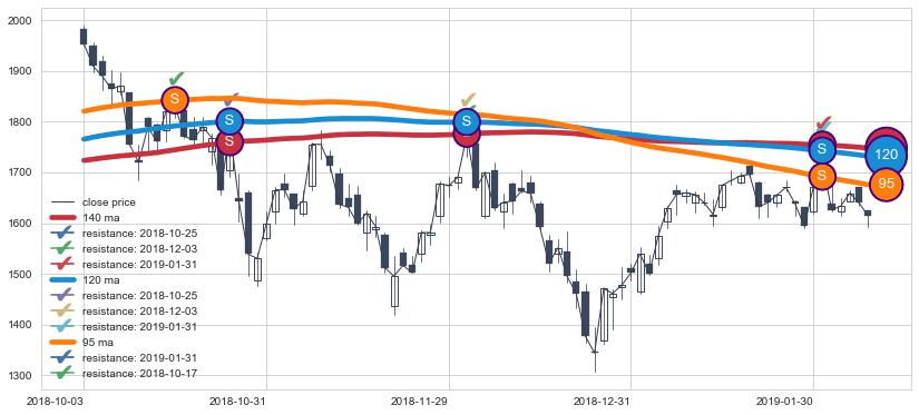 下跌趋势2018-10-03-2019-02-07,均线120, 140, 95确认关键阻力4处